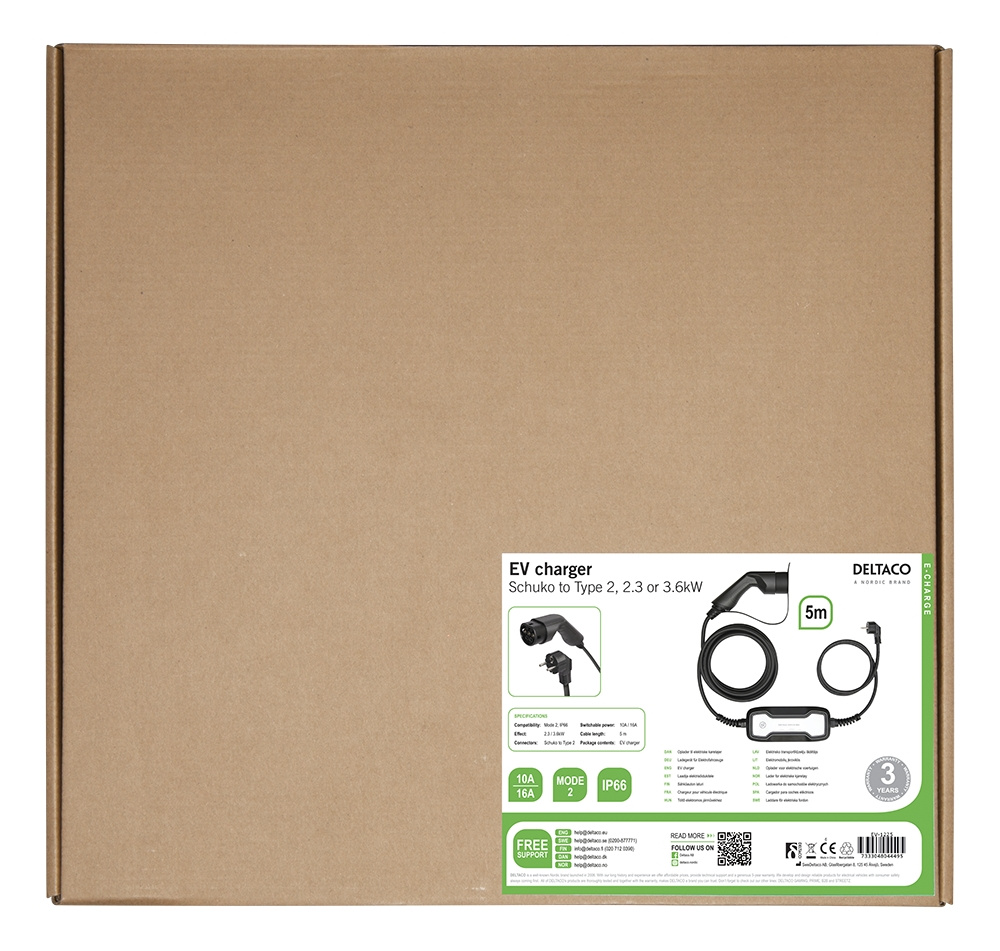Deltaco e-Charge EV-1225 ladekabel passer til alle kjøretøy med en Type 2-kontakt for de som ønsker å lade via en standard Schuko såkalt modus 2 veggkontakt lader. Lader strøm opp til 3.6KW. Justerbar ladestrøm mellom 10A eller 16A. Sølvbelagte tilkoblinger garanterer god kontakt og lang levetid. Lengde 6M. Type 2-kontakten er utstyrt med støvdeksel for å beskytte mot støv, smuss og fuktighet under lagring. Kabelkontrollboksen har en innebygd type A jordfeilbryter.