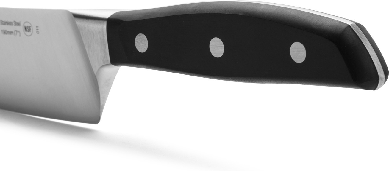 En smidd kokkekniv av høy kvalitet med et 19 cm langt blad som egner seg godt som en universalkniv på kjøkkenet. Inspirert av japanske santoku- og kirsebærkniver. Det smidde bladet har en vippende bevegelse, slik at det er enkelt å skjære kjøtt, fisk og grønnsaker. ARCOS knivene er profesjonelle verktøy med utmerket valuta for pengene. Knivene er produsert i den spanske knivproduksjonstradisjonen i provinsen Albacete siden 1745, og er laget av smidd Nitrum rustfritt stål med en hardhet på C56 på Rockwell-skalaen. Også dette stålet er produsert i Spania.