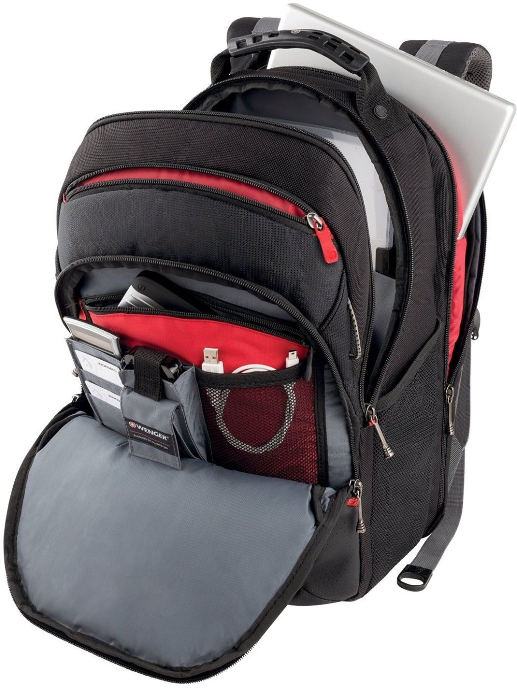 Wenger Legacy-ryggsekk for 16" bærbar PC er lett og behagelig å bære. De mange lommene og den smarte utformingen sørger for at arbeidsutstyret holdes i orden.