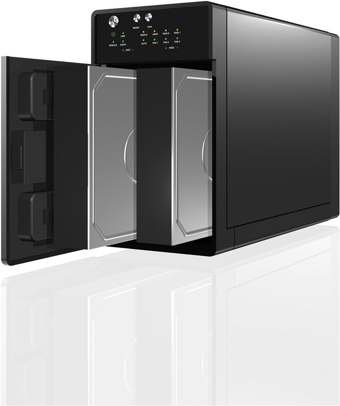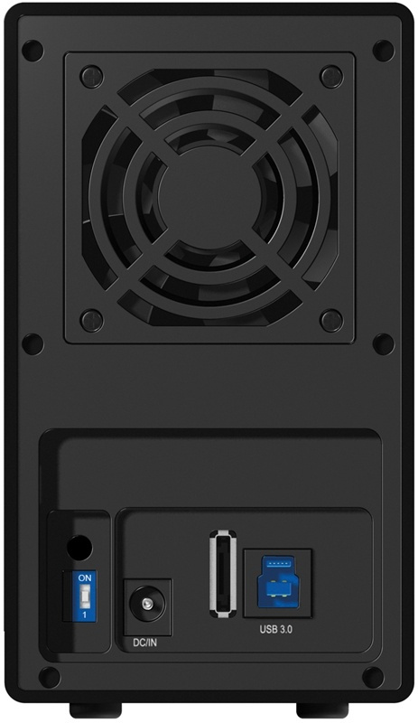 Stilig eksternt RAID-kabinett for to 3,5" SATA-harddisker. På baksiden finner vi DIP-bryteren som avgjør om volumene blir RAID 0/1 eller JBOD. Kobles til med den medfølgende USB 3.0-kabelen eller SATA-kabelen. Boksen kjøles ned av en 60 mm vifte på baksiden.