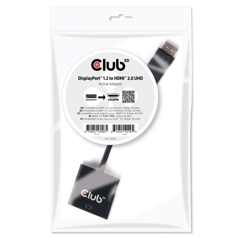 CLUB3D DisplayPort 1.2 til HDMI 2.0 UHD aktiv adapter. Tilkobling 1: Displayport 1.2, Tilkobling 2: HDMI 2.0, Kabellengde: 0,21 m. Produktfarge: Svart