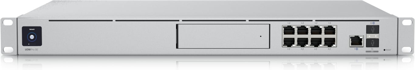 Ubiquiti UniFi Dream Machine Pro Special Edition er en alt-i-ett-enhet for store og mellomstore bedrifter. Enheten kombinerer blant annet brannmur, rask dual-WAN (10G SFP+ og 2,5GbE RJ45-porter), administrerbar Gigabit PoE-svitsj, UniFi-kontroller og NVR med 128 GB integrert harddisk.