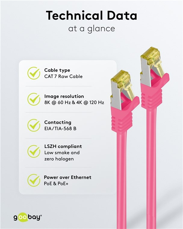- CAT-7-kabelen er egnet for Power over Ethernet (PoE, PoE+) og 10 Gigabit Ethernet med hastigheter på opptil 10/100/1000/10000 Mbit/s.