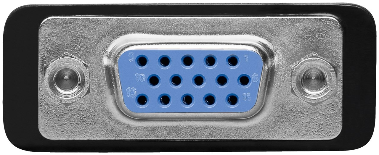 - VGA-adapter med robust, svart plastkabinett for holdbarhet og stabilitet