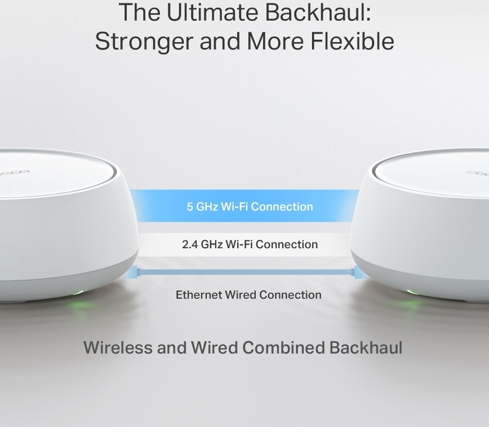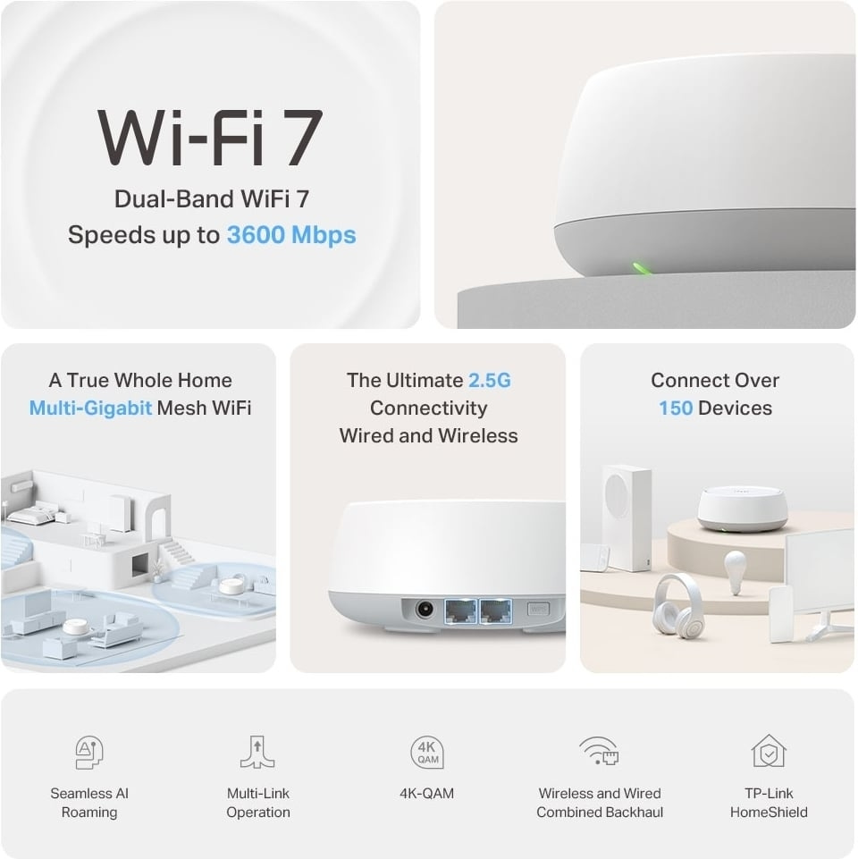 Deco BE25 er en Wi-Fi-løsning for hele hjemmet som holder nettverket ditt sterkt uansett størrelsen og utformingen på hjemmet ditt. Basestasjonene kan installeres for å bruke et trådløst eller kablet nettverk, eller en kombinasjon av begge, for å sikre best mulig forbindelse mellom basestasjonene. Systemet bruker ett nettverksnavn og bytter sømløst mellom basestasjonene ved hjelp av kunstig intelligens (AI-Driven Mesh), og takket være multi-link-drift (MLO) kan det utnytte flere dataoverføringsbånd og ulike frekvenser effektivt. Systemet støtter opptil over 150 samtidige brukere. Deco BE25 er også kompatibel med WiFi 5- og WiFi 6-enheter. Det er enkelt å utvide nettverket med Deco-rutere TP-Link.