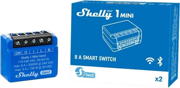 Shelly 1 Mini Gen3 er en svært kompakt Wi-Fi-styrt smartbryter for intelligent styring. Shelly Med 1 Mini Gen3-kontrolleren kan du automatisk styre lys, garasjedør, vanningsanlegg eller andre små elektriske apparater, både hjemme og når du er borte. Shelly 1 Mini Gen3 er liten nok til å passe inn i nesten alle veggbrytere eller stikkontakter, og den kan også installeres i etterkant.