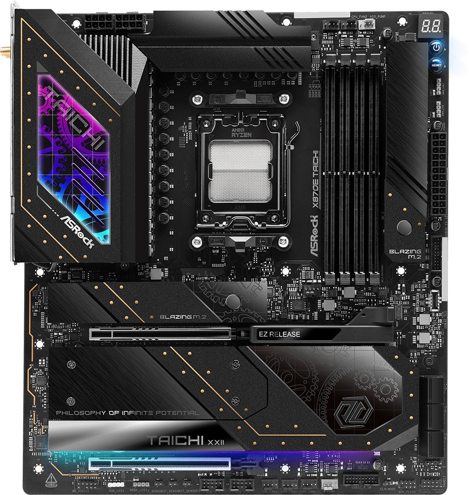 X870E Taichi har innovativ design og moderne materialer. Et hovedkort som takler alle oppgaver – med Taichi-stil!