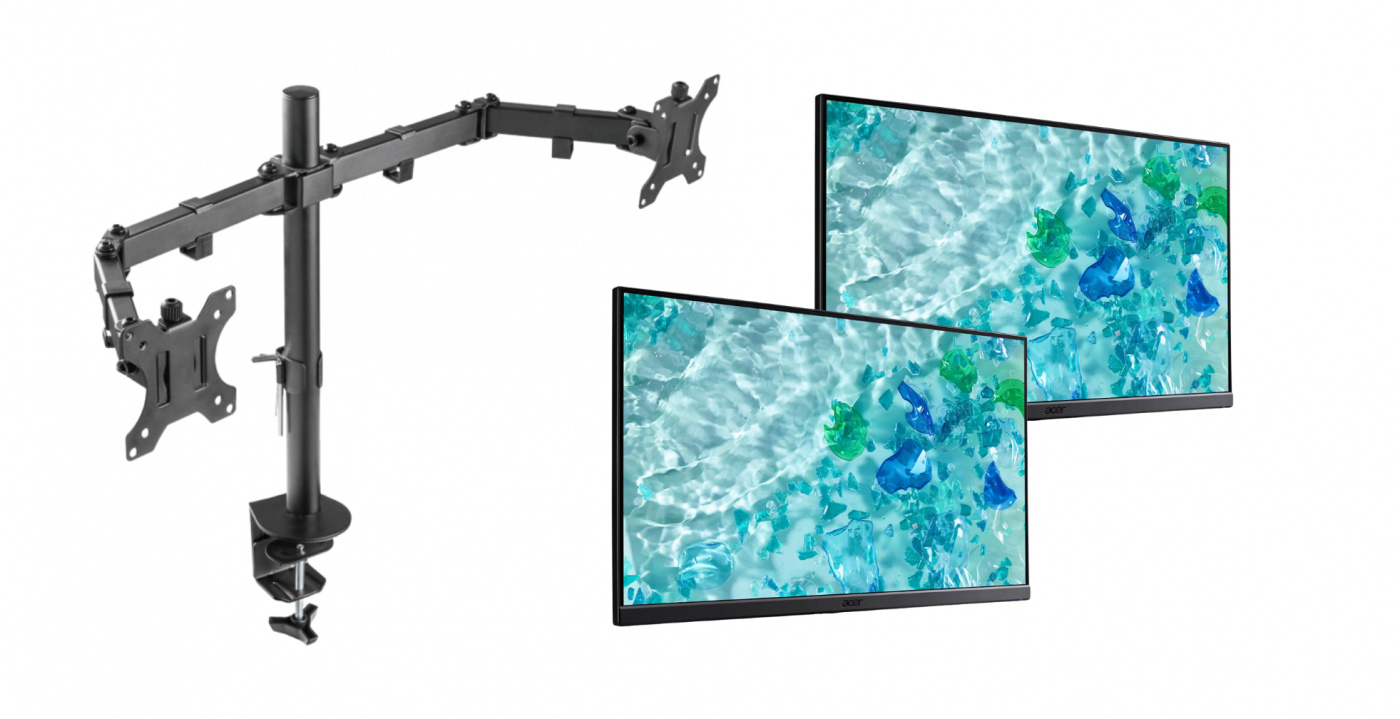 Dette er en komplett pakke med et Deltaco Gaming GAM-040 skjermfeste og to Acer V247Y-skjermer.