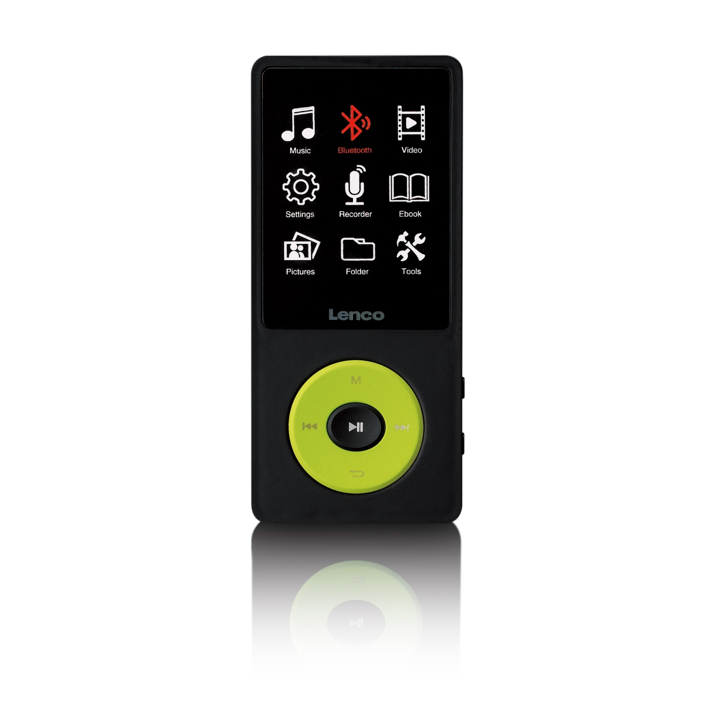 Lenco Xemio-860GN leveres med en USB-kabel og Lenco-øretelefoner. Lenco Xemio-860 er tilgjengelig i tre farger: svart/grå, svart/blå og svart/lime.