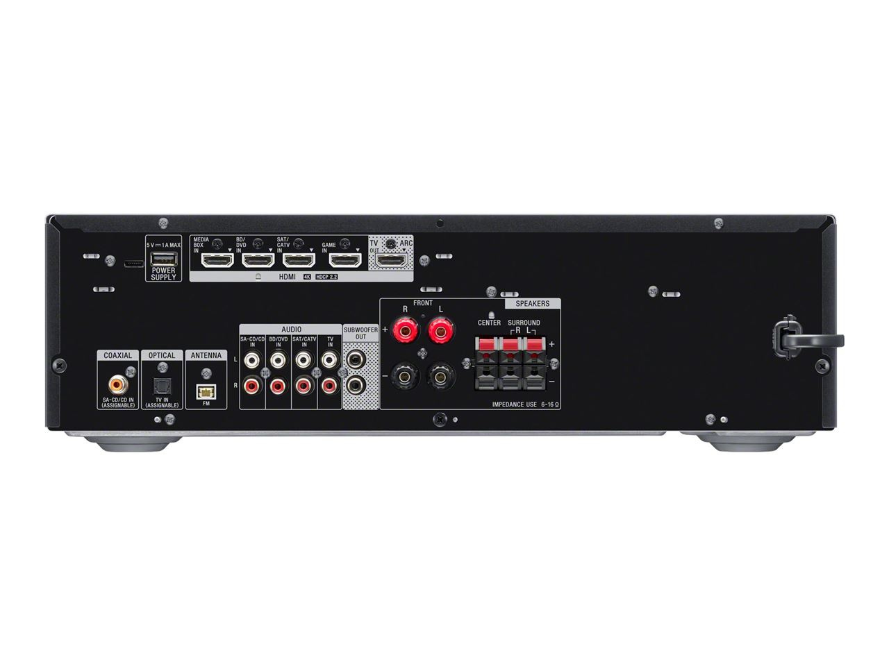 Et virkelig dynamisk hjemmeunderholdningsoppsett. Det er fire HDMI-innganger og én utgang pluss optiske/koaksiale digitale og analoge lydtilkoblinger, slik at du enkelt kan koble til TV-en, UHD Blu-ray Disc-spilleren, spillkonsollen og mer.