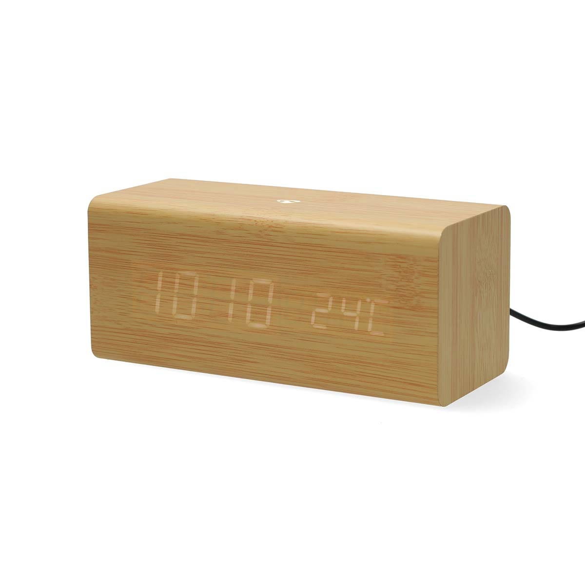 Med sin kompakte design (163 x 73 x 70 mm) passer klokken lett på et hvilket som helst nattbord, hylle eller kontorpult, og takket være trefinishen passer den sømløst inn i moderne eller minimalistisk interiør.