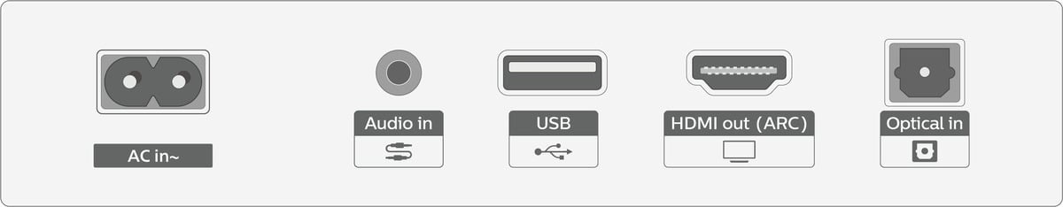 - HDMI, optisk lyd, hodetelefonkontakt 3,5 mm, USB