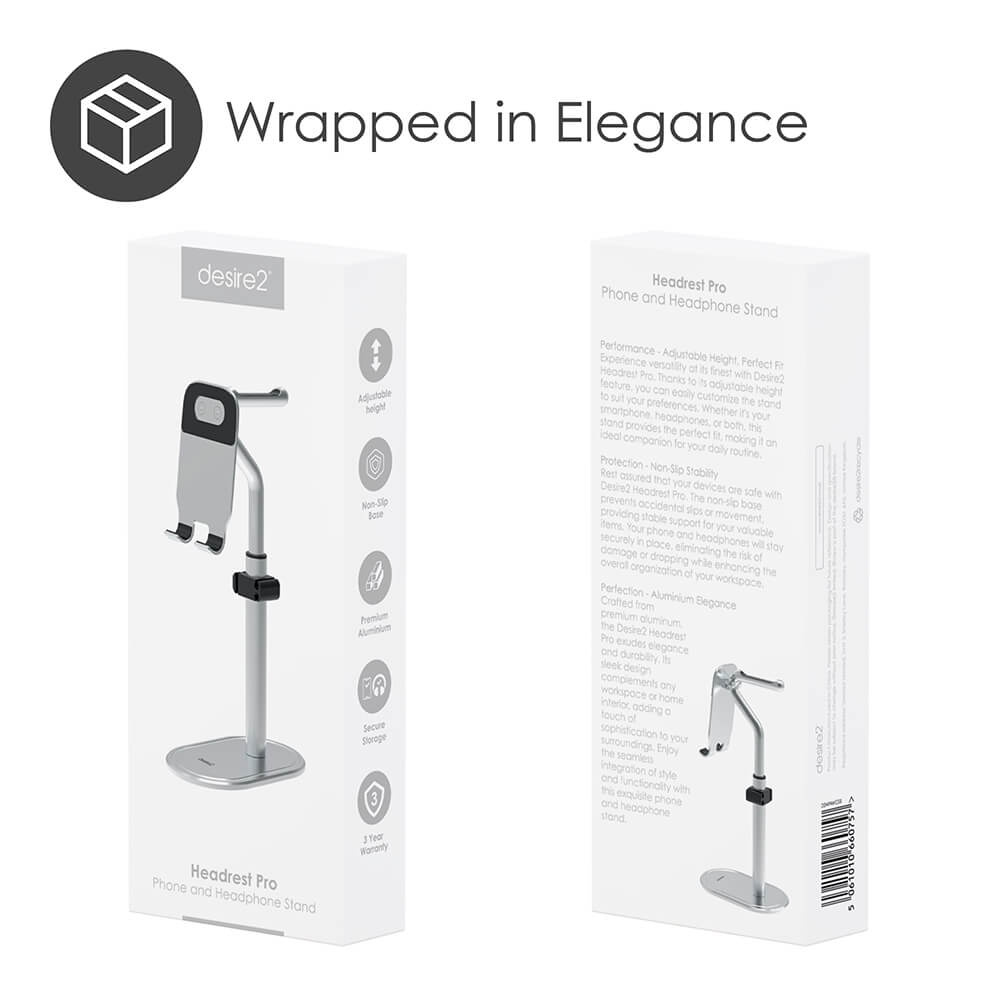 Desire2 Headrest Pro er et innovativt hodetelefonstativ og mobiltelefonholder i ett. Det er symbolet på elegant og funksjonelt design med pene linjer og justerbar høyde.