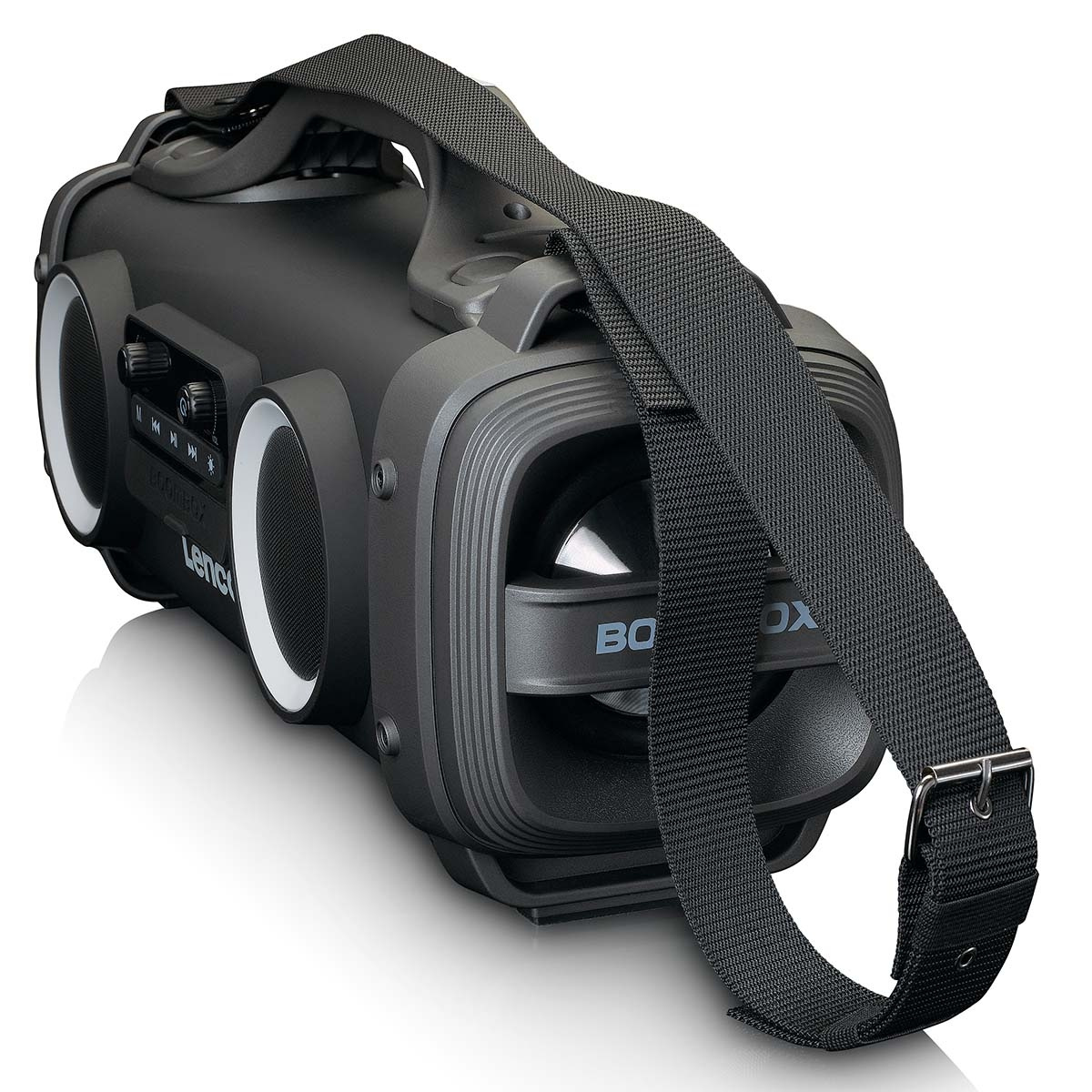 SPR-200BK er perfekt for fest innendørs eller utendørs, for denne bærbare boomboxen har et oppladbart batteri som gjør at du enkelt kan ta den med deg hvor som helst. Andre viktige funksjoner er en lydutjevner, bassjustering, skulderrem og lyseffekter.