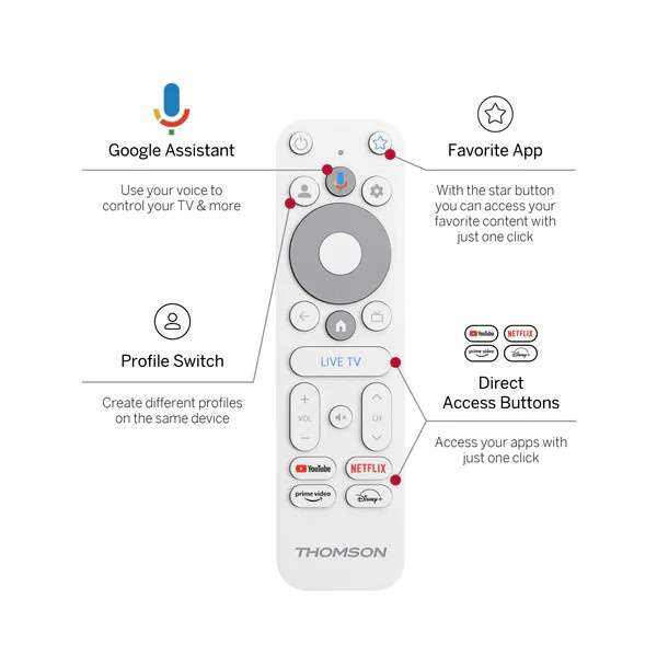 Den medfølgende fjernkontrollen er designet for komfort og hastighet og har stemmestøtte for Google Assistant. Si bare hva du leter etter – fra trendy YouTube-klipp til den nyeste storfilmen – og la dongelen gjøre resten. Direktetaster gir rask tilgang til de mest brukte appene dine.