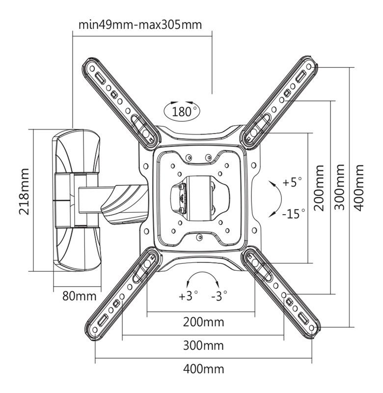 ARM-0256 er et helbevegelig veggfeste for de fleste flatskjermer mellom 23"-55" opp til 35 kg. Armen kan forlenges opp til 305 mm for full bevegelsesfrihet, slik at du kan plassere skjermen perfekt - sving opp til 90° hver vei og vipp fra -15° til +5°. Denne forhåndsmonterte armen leveres komplett med innebygd kabelhåndtering og dekorative deksler for å sikre et stilig og ryddig utseende. Den innebygde nivåjusteringen gir 3° rotasjon med og mot urviseren for å sikre perfekt nivåjustering. Veggfestet er kompatibelt med VESA-dimensjonene 75x75,100x100,200x100,200x200,300x200,300x300,400x200,400x300,400x400.