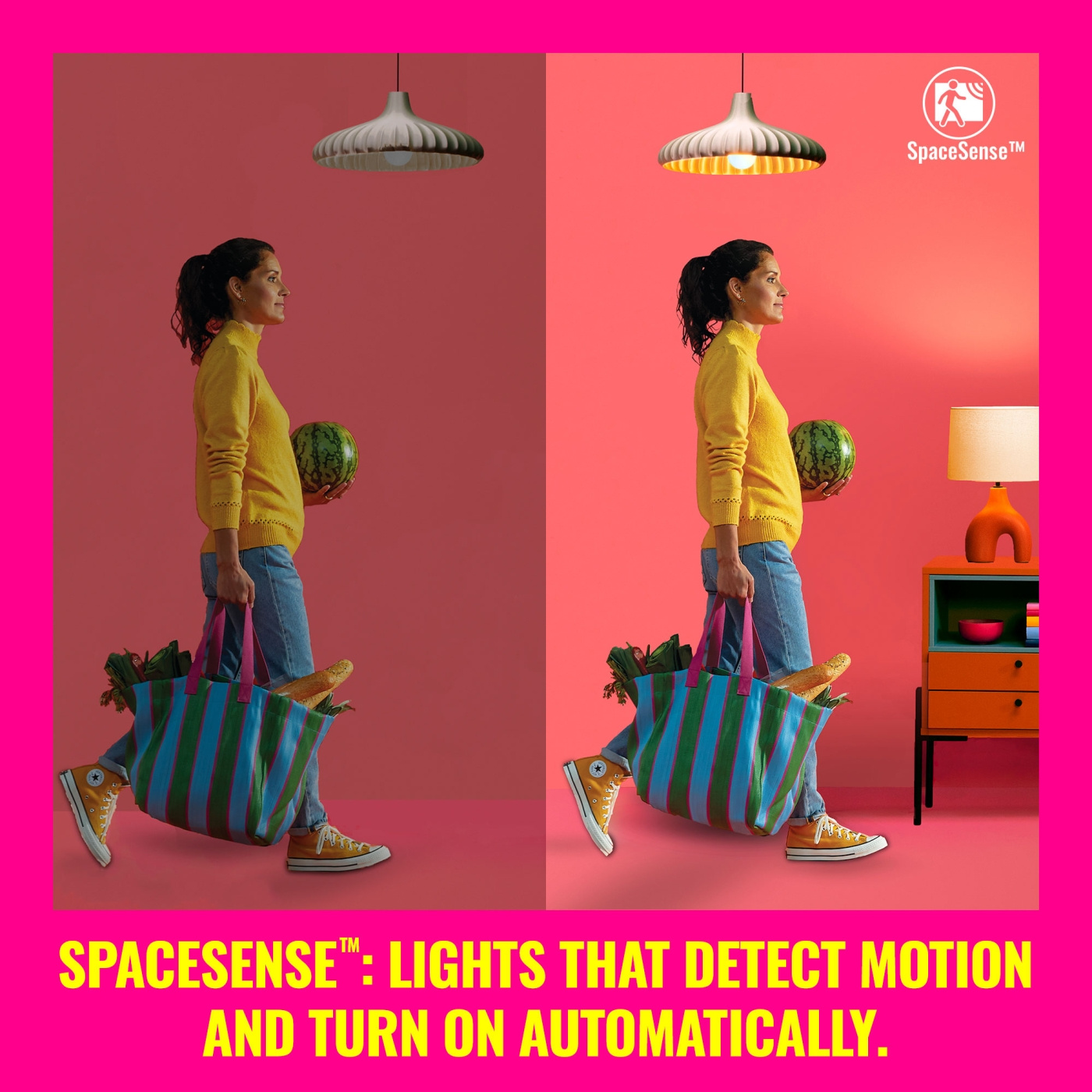 WiZmatters SpaceSense-teknologi gjør enhetene dine om til bevegelsessensorer. Aktiver SpaceSense-funksjonen i WiZ-appen og slå automatisk av og på lys og enheter ved bevegelsesdeteksjon. Det kreves minst to WiZ-enheter i et rom for at SpaceSense-funksjonen skal fungere. Det kreves ingen separat sensor.