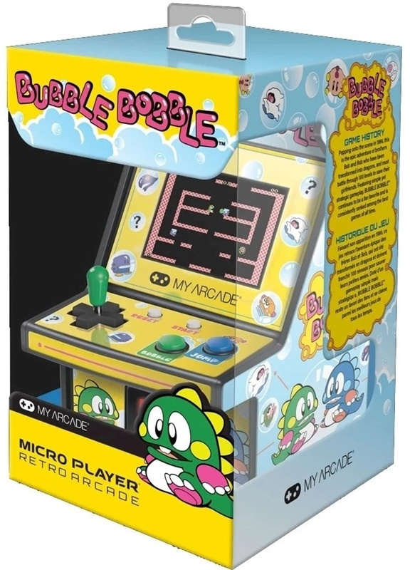 i 1986 kom spillet Bubble Bobble på markedet. Det er et episk eventyr med brødrene Bob og Bub, som har blitt forvandlet til små drager og må ta seg gjennom 100 nivåer for å redde venninnene sine. My Arcade Bubble Bobble er fortsatt en favoritt etter så mange år, takket være arkademaskinen Micro Player.