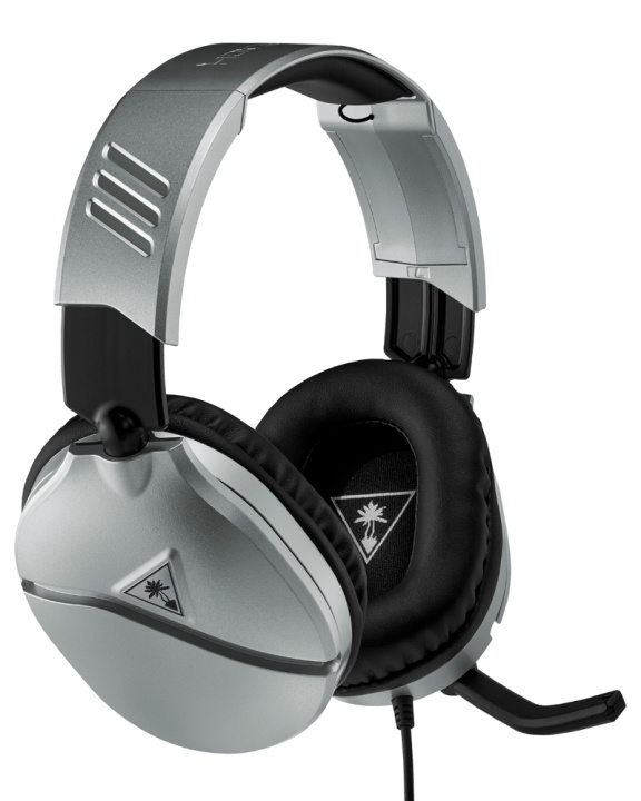 Turtle Beach® Recon 70 Silver gaming-hodesettet har en lett og komfortabel design, 40 mm over-ear-høyttalere av høy kvalitet og en høysensitiv mikrofon som kan vippes opp.