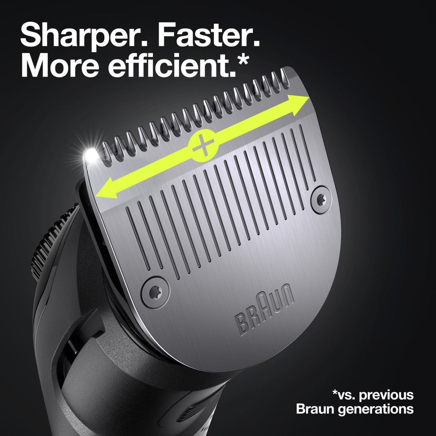 Sammenlignet med tidligere trimmereSkarpere. Raskere. Braun Braun Braun Mer effektiv: BT 7 har et større klippeområde enn noen tidligere trimmer, og fanger opp og klipper mer hår i hvert strøk (sammenlignet med tidligere trimmere)