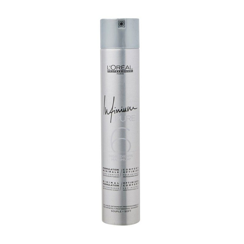 L'Oréal Infinium Pure Soft Hairspray 500 ml er en hypoallergenisk profesjonell hårspray uten parfyme eller maskerende duft. Den nye formelen er redusert til et minimum for maksimal komfort. Gir øyeblikkelig hold uten at håret føles stivt. Gir et mykt hold, noe som resulterer i en naturlig finish med ultimat glans. Inneholder kun 6 ingredienser sammenlignet med 15 ingredienser i en vanlig hårspray.
