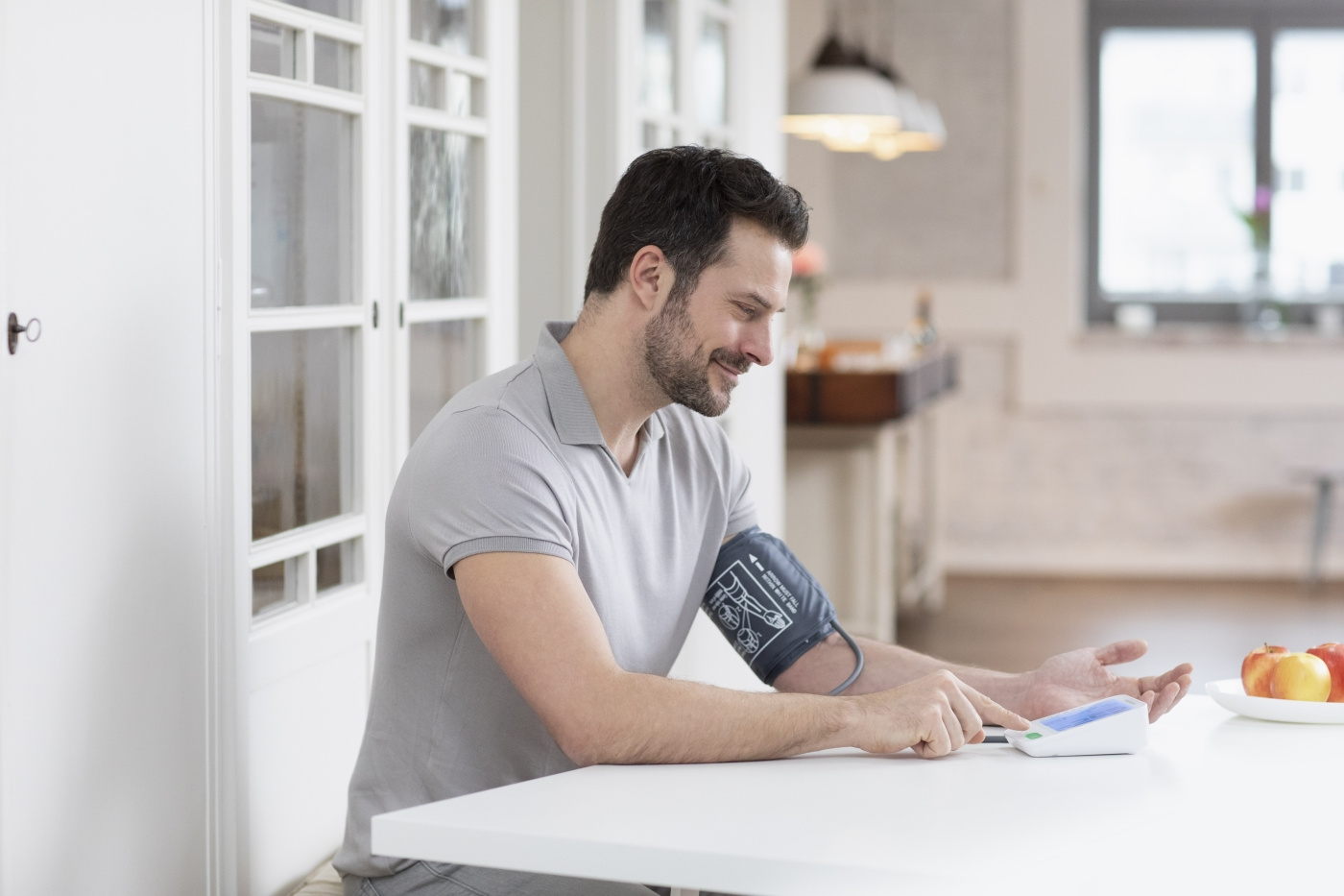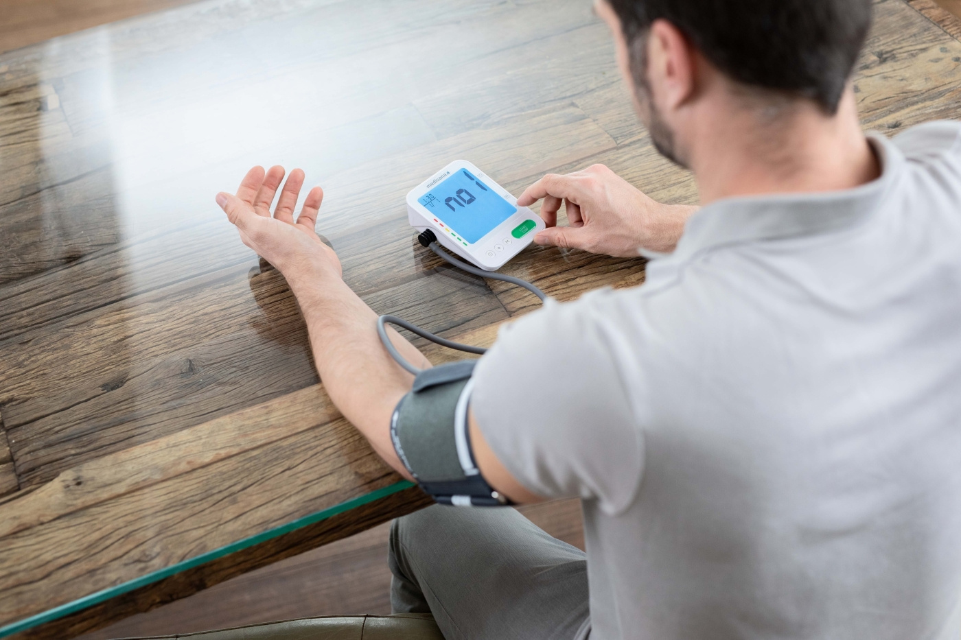 En tydelig og brukervennlig blodtrykksmåler med stor skjerm og blå bakgrunnsbelysning.