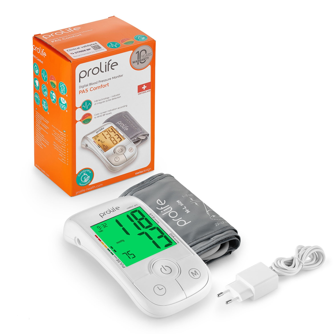 Denne digitale blodtrykksmÅleren fra PROLIFE er utstyrt med ComfortPro-teknologi, som begynner Å mÅle blodtrykket mens mansjetten blÅses opp for Å minimere ubehag og Øke brukervennligheten. IHB-teknologien er i stand til Å oppdage arytmi, noe som sikrer pÅlitelige resultater selv ved uregelmessig puls. Hvis arytmiindikatoren vises ofte, anbefales det Å oppsØke lege.