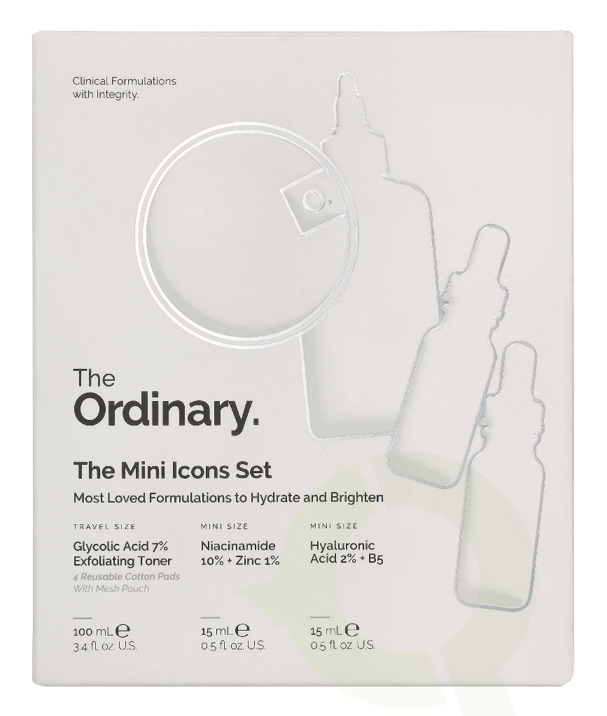 The Ordinary The Mini Icons Set 130 ml Glycolic Acid Exfoliating Toner 100ml/Niacinamide 15ml/Hyaluronic Acid 15ml/4 Cotton Pads/Mesh Pouch