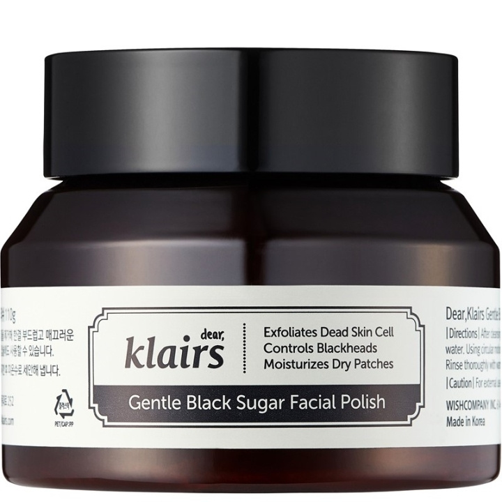 Klairs Gentle Black Sugar Facial Polish er en 100 % veganvennlig peeling som eksfolierer, gir fuktighet og etterlater huden myk og silkeaktig. Den har et høyt innhold av svart sukker som fjerner døde hudceller og hudormer og renser porene på dypet. Den er antibakteriell og forebygger aldringstegn ved å stimulere cellefornyelsen, samtidig som den behandler og fukter tørr og flassende hud.110 g