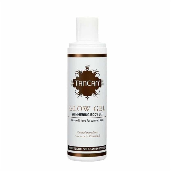 TanCan Glow Gel Shimmering Body Gel er en silkemyk, klar gel med glitrende gullkorn som gir huden en øyeblikkelig gyllen glød. Huden blir gjenfuktet samtidig som de små glitrende gullkornene reflekterer lyset og gir en vakker glans til solkysset hud. Glow Gel er beriket med Aloe Vera, som raskt trenger inn i huden og fukter i dybden. Vitamin E virker som en kraftig antioksidant og motvirker frie radikaler.brukKan brukes daglig og over hele kroppen eller der man ønsker ekstra glans og lyster (unngå øyeområdet). Vaskes lett av med såpe og vann. TanCan TanCan Brukes etter en brun-uten-sol-behandling eller etter WASH OFF for å gi ekstra dybde til den solkyssede huden.