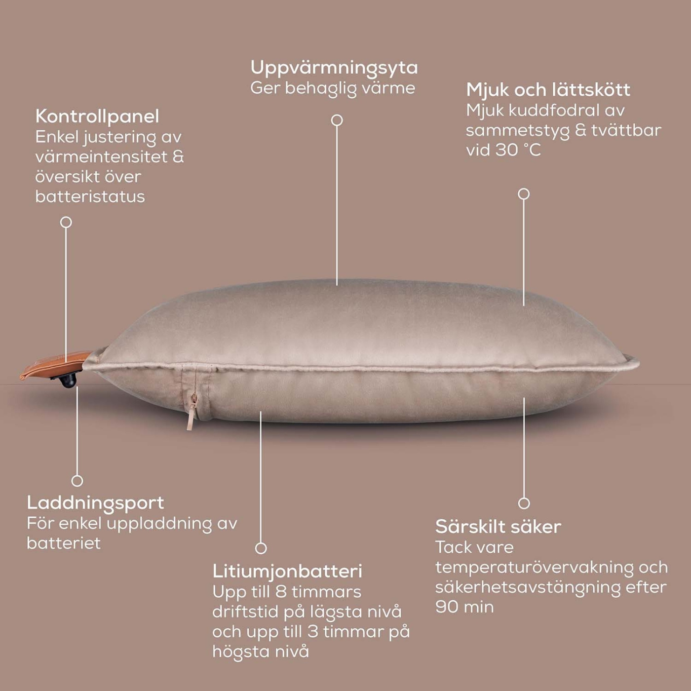 Det kraftfulla litiumjonbatteriet ger upp till 8 timmars värme, och med tre justerbara temperaturnivåer kan du enkelt anpassa värmen efter dina behov. Den intuitiva kontrollpanelen gör den enkel att använda, och den automatiska säkerhetsavstängningen efter 90 minuter ger trygg användning. Kuddfodralet är maskintvättbart – praktiskt och hygieniskt.