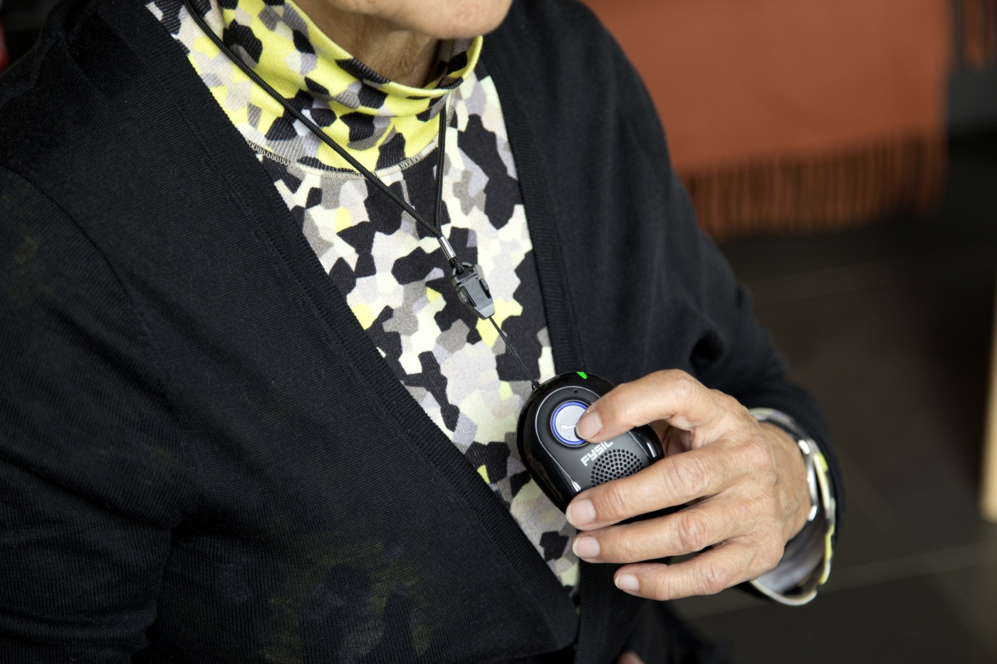 • Med den trådløse alarmknappen kan du snakke og lytte håndfritt, så du trenger ikke telefonen for å bruke den.