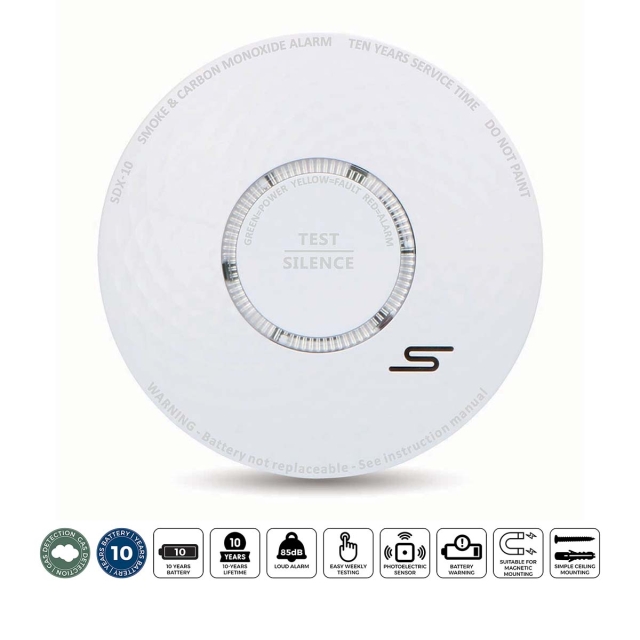 Alarmen er ekstra høy, slik at du ikke kan gå glipp av den. Du vil også høre den i søvne. Det finnes en knapp for å stoppe alarmen midlertidig når du har funnet brannårsaken og slukket den. Du kan montere den slitesterke røyk- og karbonmonoksidalarmen i taket. Monteringsmaterialet er inkludert, noe som gjør monteringen enkel.