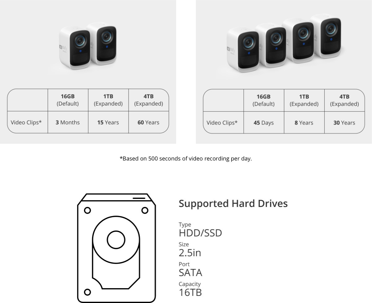 Eufycam 3C gjør opptak basert på bevegelsesdeteksjon. Den medfølgende hjemmestasjonen har et innebygd EMMC-minne på 16 GB for kameraopptak. Internminnet har plass til ca. 45 dagers opptak fra fire 4K eufycam-kameraer (totalt maksimalt 500 sekunders opptak per dag). Hjemmestasjonen har imidlertid også en 2,5" SATA-tilkobling for en separat installert HDD/SSD-harddisk (maks. 16 TB). Den lokale lagringsplassen kan derfor i beste fall være på flere terabyte. Alle lokale opptak er kryptert med 128-biters AES-kryptering. S380-hjemmestasjonen kan kobles til totalt 16 kameraer og i tillegg 34 sensorer. Den fornyede hjemmestasjonen kan fungere som en gateway for nesten alle eufy- og eufycam-enheter (krever en oppdatering av hjemmestasjonen som vil bli utgitt senere.) Så nå kan også de Eufy-enhetene som tidligere har fungert uavhengig og lagret i sitt eget innebygde minne, fungere via en hjemmestasjon.