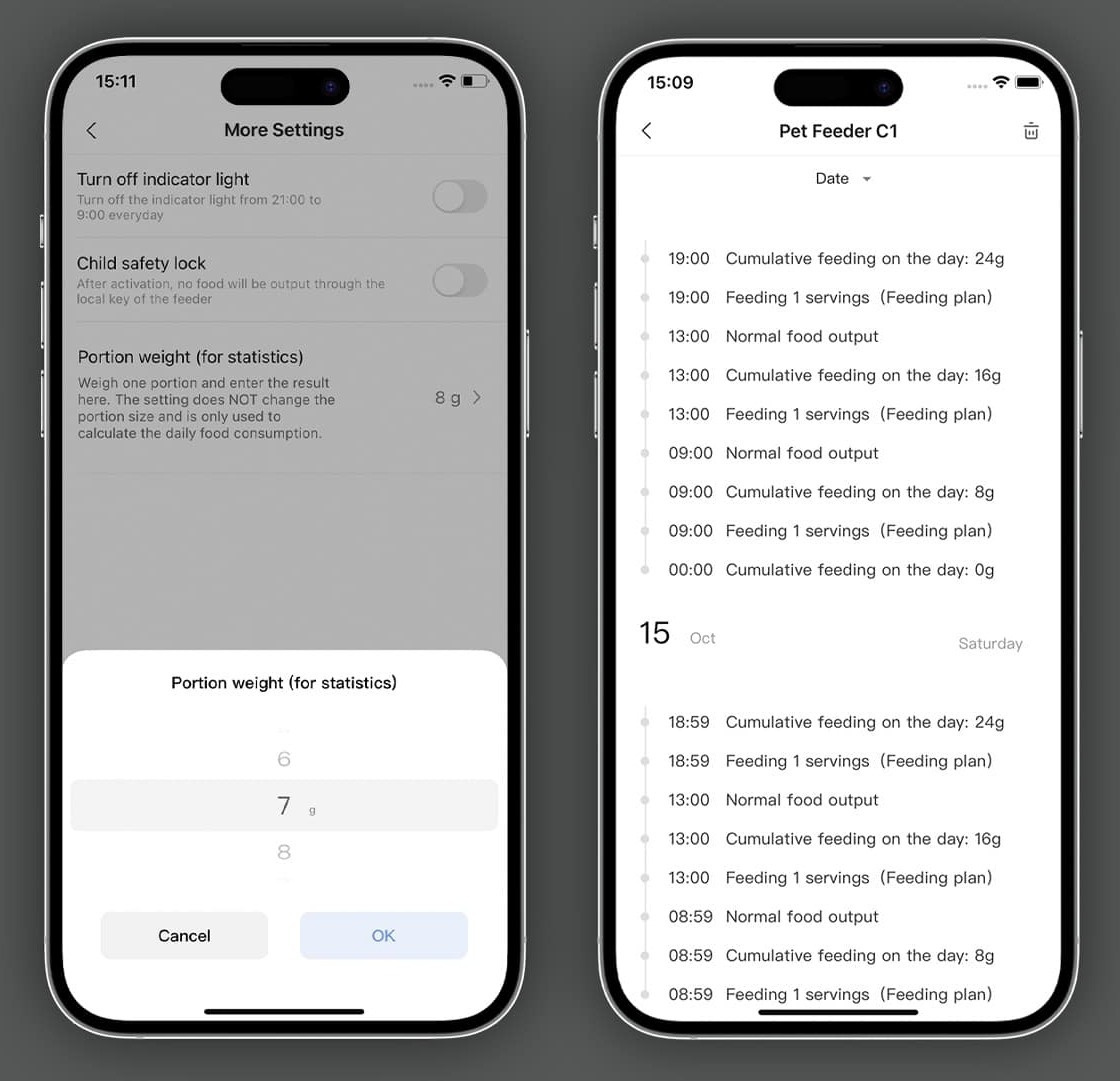 Aqara Med Pet Feeder kan du styre fôringen av kjæledyret ditt mens du er ute og reiser, er på jobb eller slapper av i sofaen. Enheten støtter fôringsplaner og tidsplaner for å holde kjæledyret ditt friskt og fornøyd. Planene fungerer selv om internettforbindelsen blir avbrutt eller Zigbee-huben slutter å fungere. Med fôringsenheten kan du overvåke det daglige matforbruket i gram og få statistikk om kjæledyrets fôring. På denne måten sikrer du at kjæledyret ditt alltid får riktig mengde næring. Den har en 4-liters matbeholder, noe som gjør den egnet for både katte- og hundemat, og den kan romme opptil 1,7 kg kjæledyrmat.