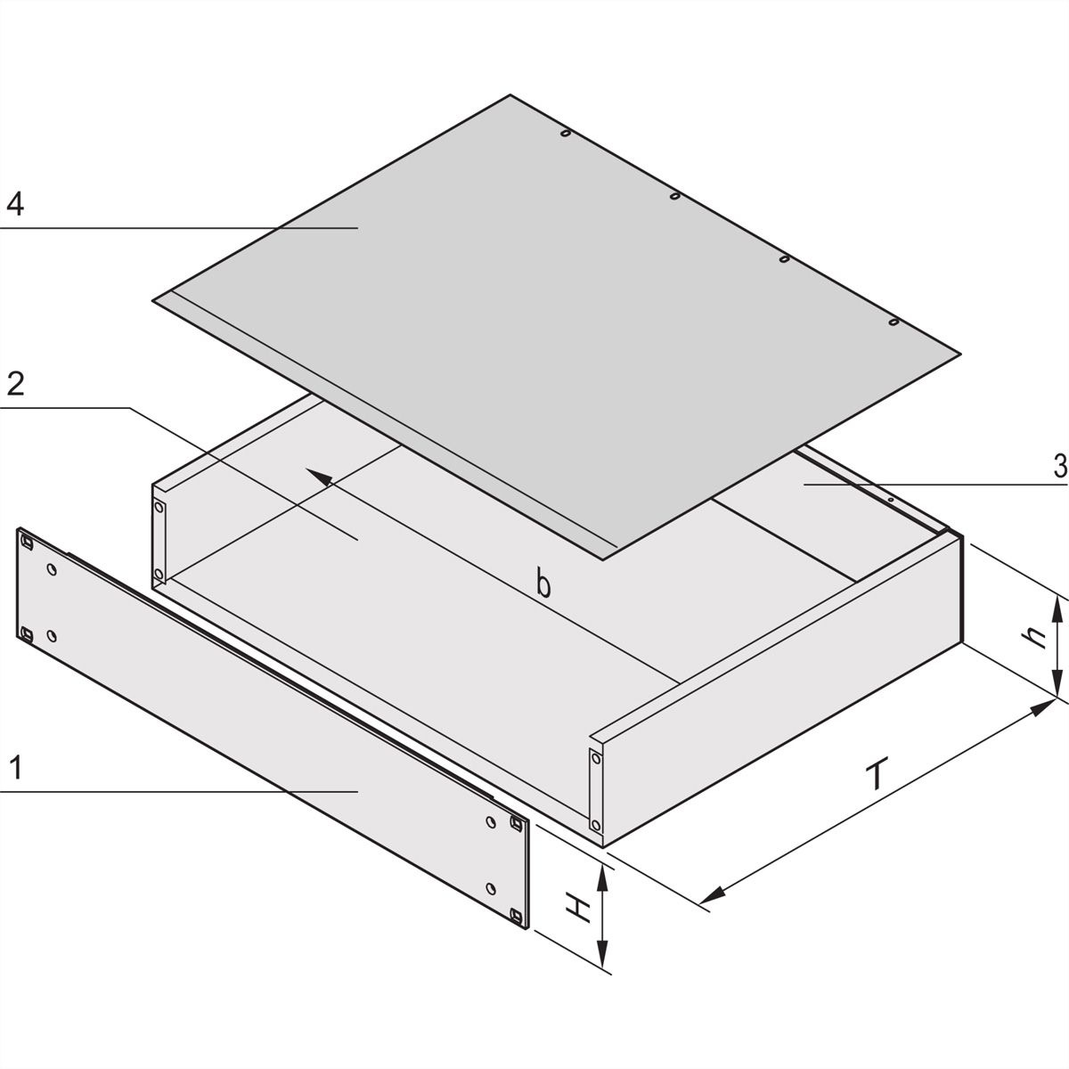 Komplett stålplateinnsats (AIZn-belagt) med frontpanel i aluminiumsprofil - avtakbart bakpanel for enkel bearbeiding - EMC-skjerming på ca. 30 dB(A) ved 1 GHz (uten ekstra skjermingsmateriale) - I henhold til standard IEC 60297-. 3-101
