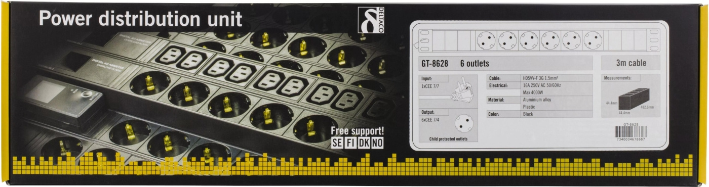 DELTACO strømskinne med 6xCEE 7/4-kontakt, 1xCEE 7/7-tilkobling, 19" 1U, 3 m kabel, svart