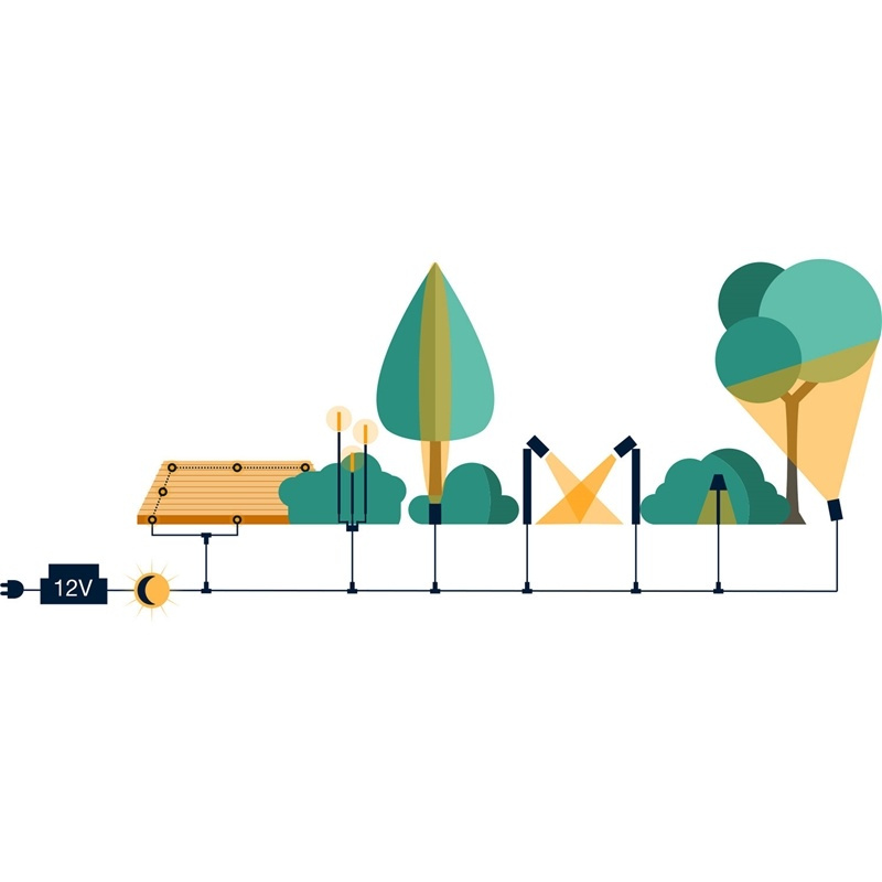 Komplett settPakken inneholder 5 Zenit Duo-armaturer (inkl. 1 m kabel per lampe), en 10 m lang grenkabel med 11 forgreninger og en 21 W transformator.