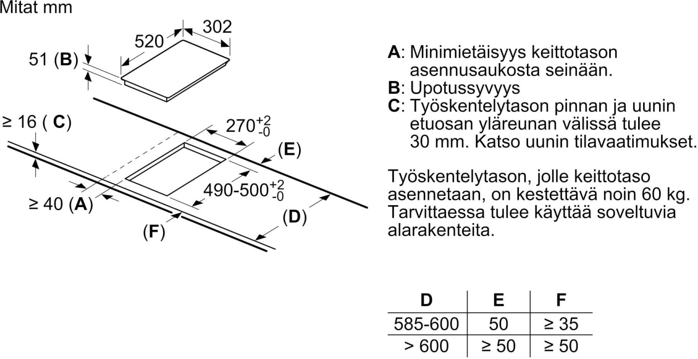 - Innbyggingsmål H x B x D (mm): 351 x 270 x (490 - 500)