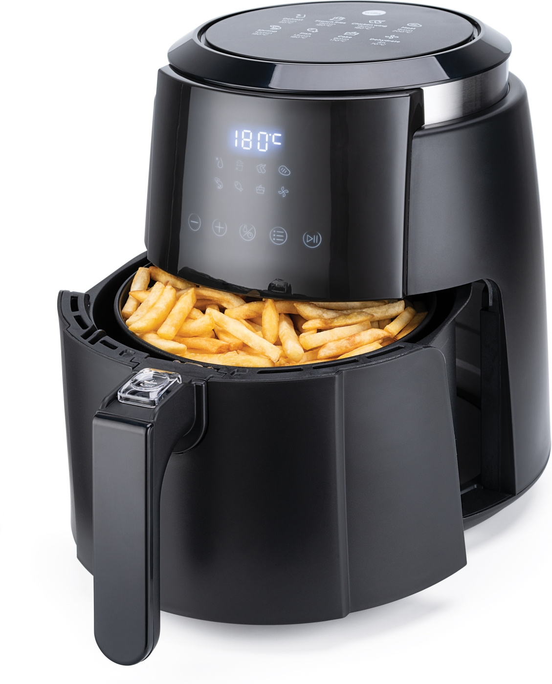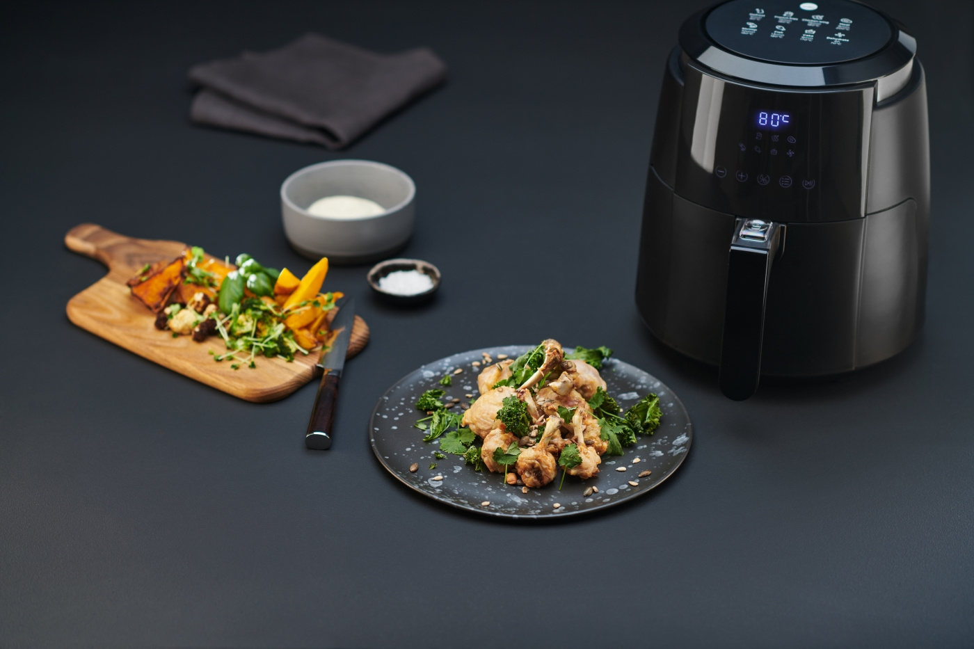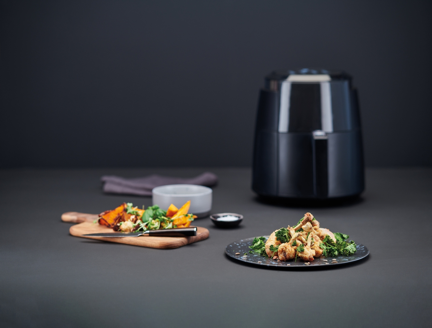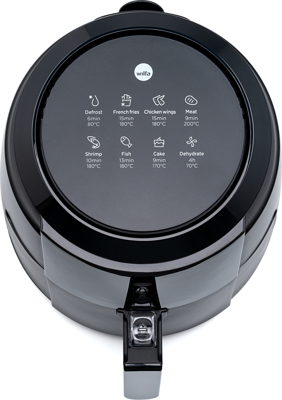 Du kan tilberede like sprø pommes frites med betydelig mindre fett enn med en vanlig frityrgryte som bruker olje. Stek kyllinglårene sprø og møre uten å bruke ekstra fett. Takket være Wilfa AF1B-350 Dual Cyclone Rapid Air-teknologien kan apparatet også brukes som f.eks. en kommersiell dehydrator.