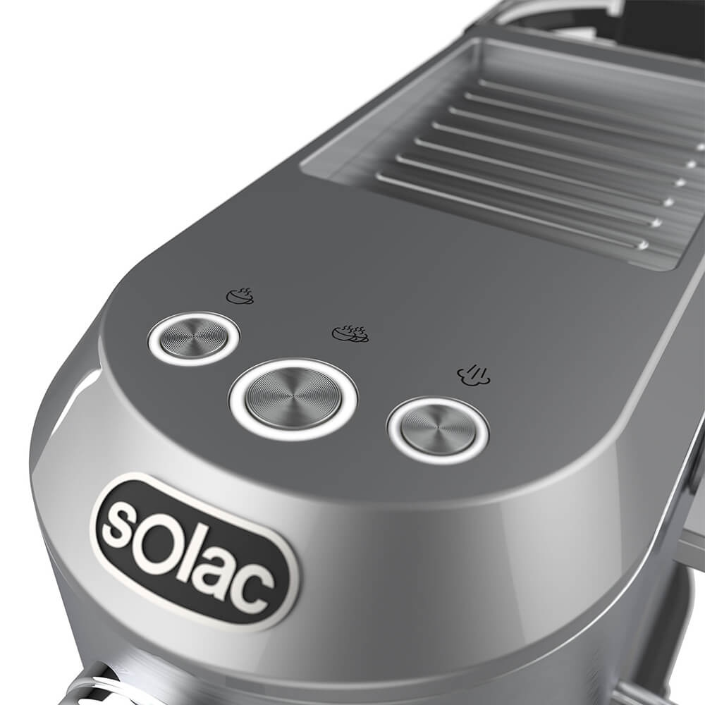 Solac espressomaskin med italiensk pumpe med 20 bar trykk for en espresso med beste krem. Leveres også med adapter i rustfritt stål med filter for kapsler.