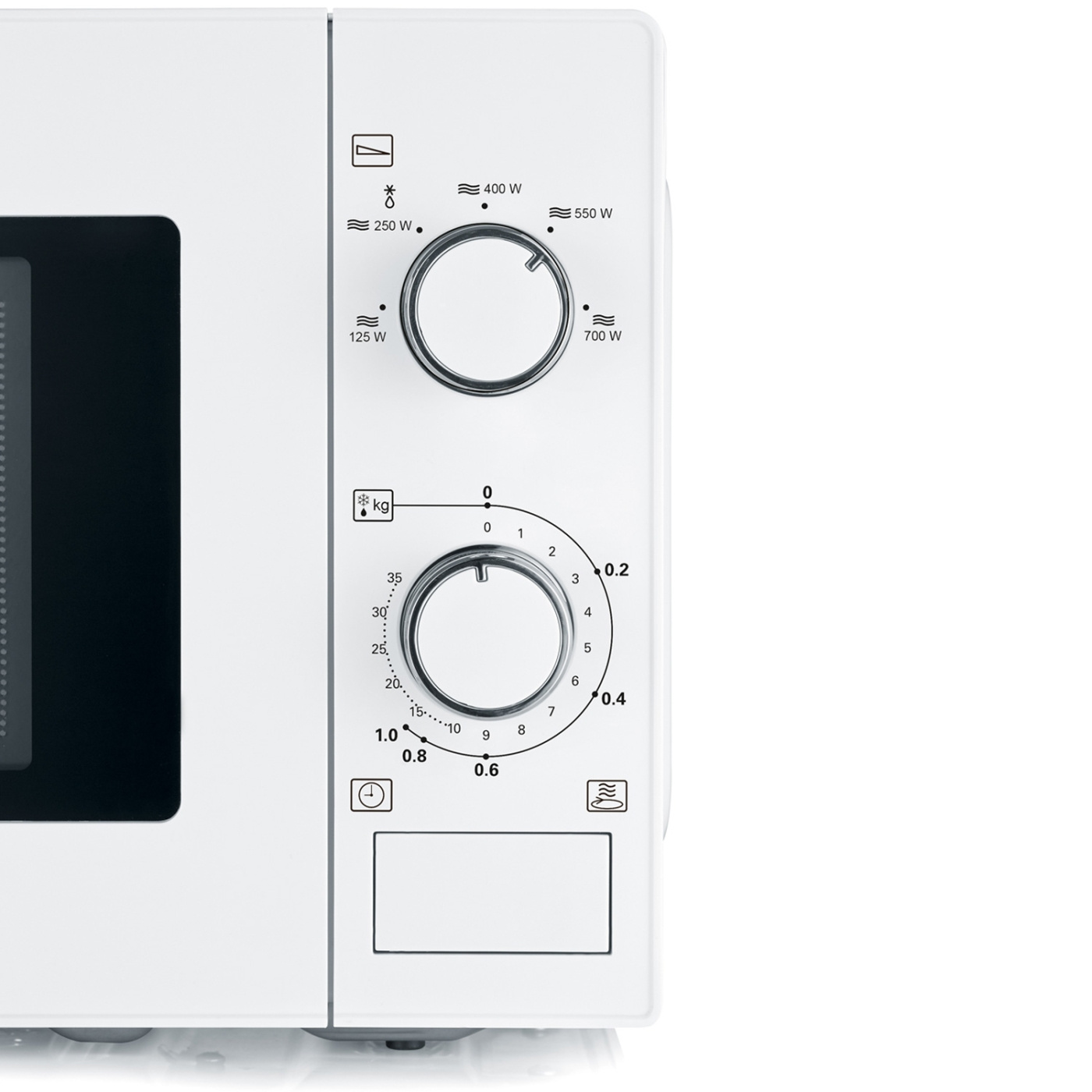 Enklare mikrovågsugn i klassisk vit design med en effekt på 700W och 20 liters kapacitet