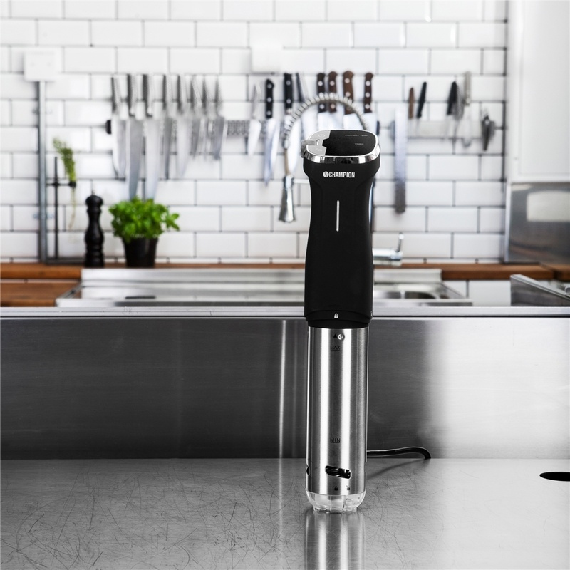 Champion Med Sous Vide er det enklere enn noensinne å tilberede kjøtt, fisk eller grønnsaker hjemme med perfekt resultat. ChampionHver gang. s Sous Vide tilbereder med en nøyaktighet på +/- 0,1 °C, noe som gir mørt og jevnt tilberedt kjøtt, og du risikerer ikke at grønnsakene blir overkokte. Samtidig beholdes matens saftighet, smak og farge. Pakk den utvalgte råvaren ved hjelp av en vakuumpakker, senk den ned i det temperaturkontrollerte Sous Vide-vannbadet og vent - enklere kan det ikke være. Stek eller grill det allerede perfekt tempererte kjøttet raskt på svært høy varme for å få en fin stekepanne før servering.