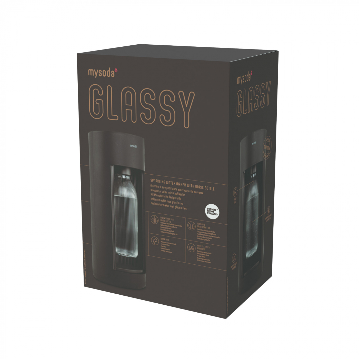 Mysoda Den nye Glassy-kullsyremaskinen setter en ny standard for kullsyremaskiner for glassflasker. Maskinens elegante og karakteristiske design kombinerer toppmoderne brukervennlighet og holdbarhet. Maskinens kropp er laget av fornybar trebasert kompositt, som har en unik matt finish med lett synlige trefibre og elegante aluminiumsdetaljer. De enkle og elegante glassflaskene er designet for å matche middagsserviset ditt. Glassy er tilgjengelig i tre forskjellige farger.