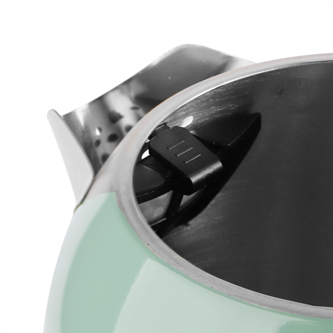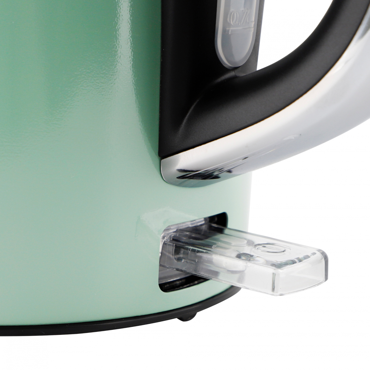 Designen är trendig med en snygg kanna i grön metall och med snygga detaljer. Vattenkokaren är praktiskt vridbar i 360 grader, har tydliga vattennivåangivelser, en av- och på knapp med ljusfunktion, temperaturmätare och automatisk avstängning.