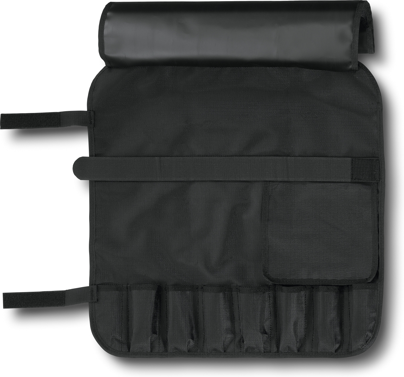 Victorinox Knivvesken er laget av slitesterk og rengjøringsvennlig PVC/polyester og kan enkelt rulles sammen. Etuiet har en lomme for navneskilt, en separat klaff som dekker de små knivene, og en borrelåsstropp som holder bladene på de store knivene på plass.