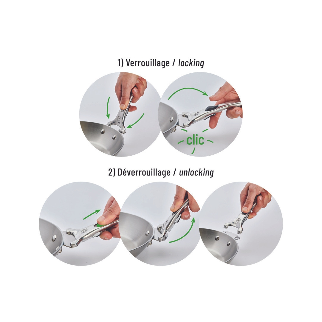 Det avtakbare håndtaket fra De Buyer er like ergonomisk som det er vakkert. Enkel festemekanisme som gjør at håndtaket kan brukes med bare én hånd. Håndtaket i rustfritt stål passer til De Buyer LOQY-serien.