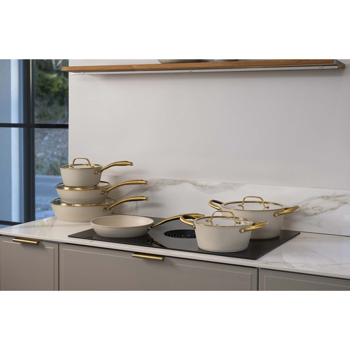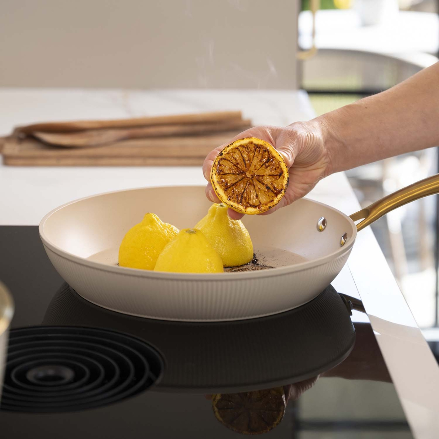 Den beige färgen tillsammans med ett guldfärgat handtag ger ett exklusivt uttryck i köket, medan den robusta kroppen i smidd aluminium säkerställer jämn värmefördelning och lång hållbarhet. Den keramiska PFAS-fria beläggningen från Greblon gör matlagningen smidig och förenklar rengöringen. Stekpannan fungerar på alla typer av spisar och är ett perfekt val för både vardagsmatlagning och mer avancerade rätter.