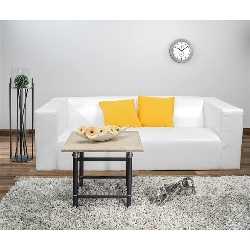 DCF radiostyrt klokke for veggmontering. Det indikerer tid, temperatur og luftfuktighet på et analogt display. Stor hvit skive med arabiske tall. Time, minutt og sekundviser.