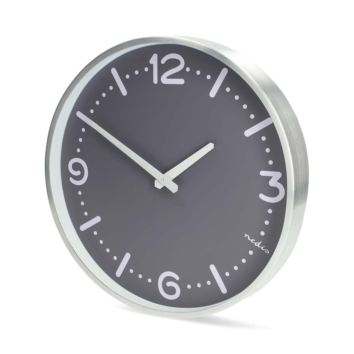 De store, hvite sifrene skiller seg tydelig ut mot den grå urskiven, noe som sikrer god lesbarhet på lang avstand. Denne veggklokken er innrammet i slitesterkt rustfritt stål med en moderne finish, og passer sømløst inn i moderne og profesjonelt interiør.